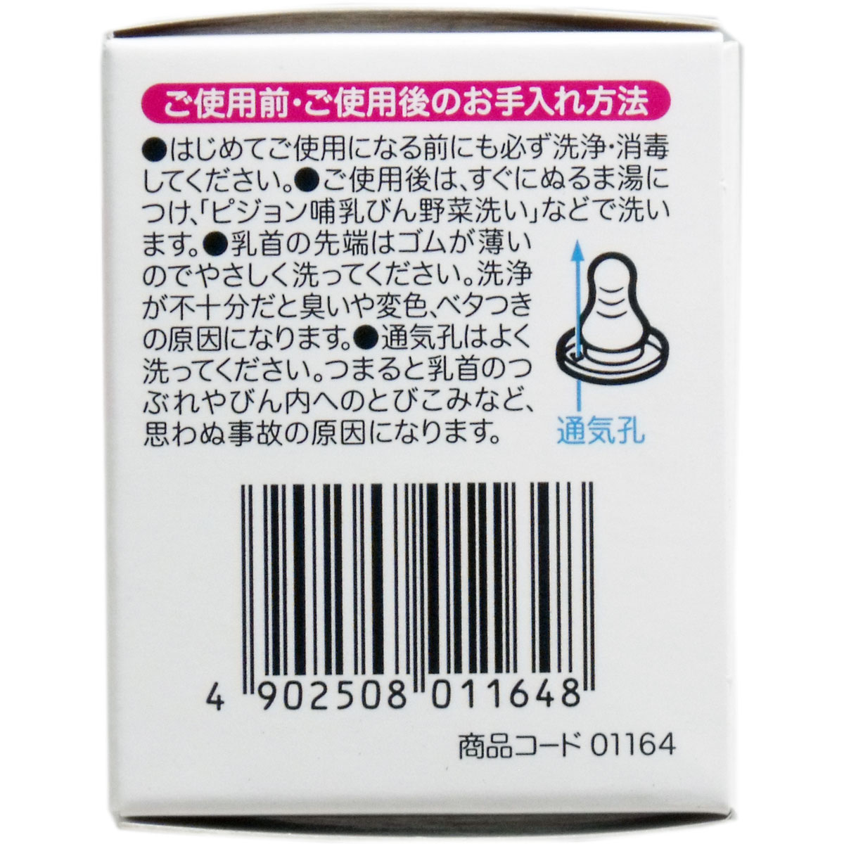 ・乳首の先端はゴムが薄いのでやさしく洗ってください。洗浄が不十分だと臭いや変色、ベタつきの原因になります。