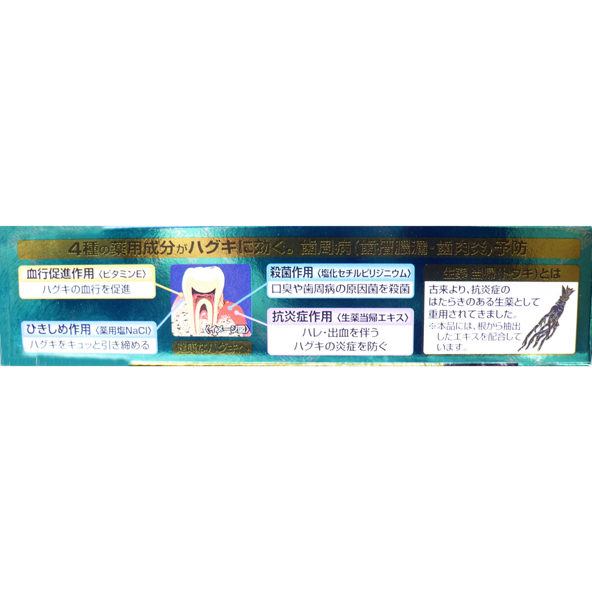 基剤:ソルビット液/清掃剤:重質炭酸Ca/薬用成分:塩化ナトリウム(薬用塩NaCl)、硝酸カリウム、酢酸トコフェロール(ビタミンE)、塩化セチルピリジニウム(殺菌剤CPC)、トウキ軟エキス(生薬当帰エキス)/湿潤剤:濃グリセリン/粘度調整剤:無水ケイ酸、CMC・Na/発泡剤:ラウリル硫酸Na、POE硬化ヒマシ油/矯味剤:塩化Mg/香味剤:香料(メディカルハーブミントタイプ)/防腐剤:パラベン/安定剤:酸化Ti