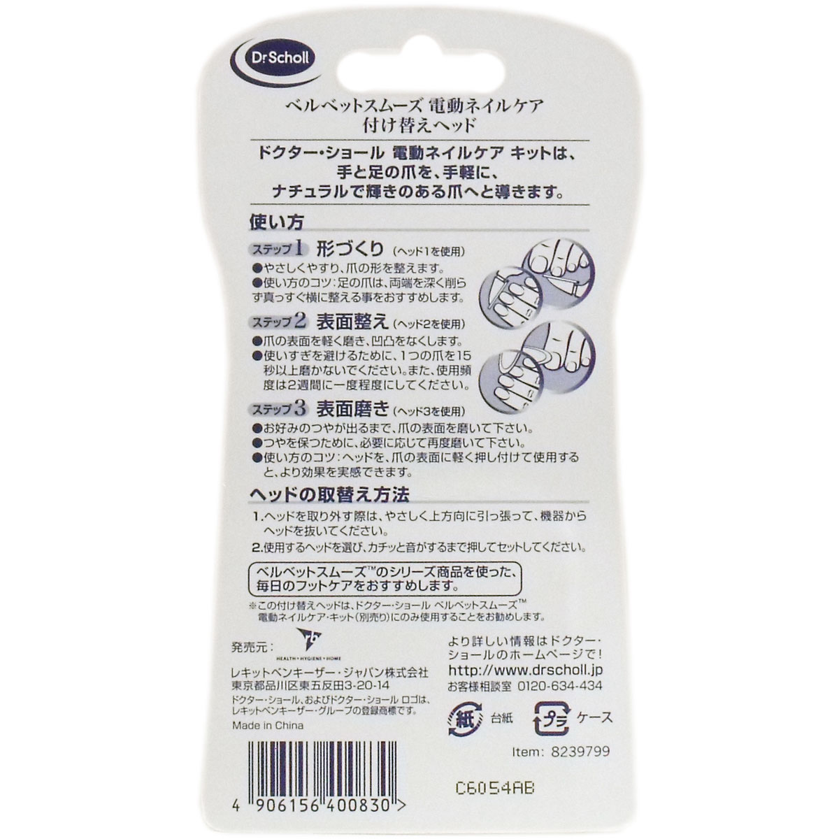 ・この付け替えヘッドはドクターショール ベルベットスムーズ 電動ネイルケア・キット(別売り)にのみ使用することをおすすめします。